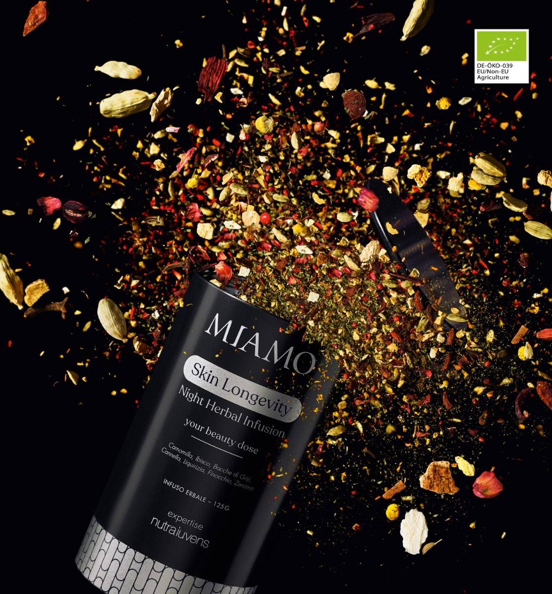 Skin Longevity Night Herbal Infusion è la tisana pro-longevità di Miamo nata dall’expertise nutraiuvens. Un ricco infuso erbale biologico con estratti selezionati a base di Camomilla, Ibisco, Bacche di Goji, Cannella Ceylon, Liquirizia, Finocchio, Zenzero. Contiene inoltre Menta Verde, Scorza D’Arancia, Chiodi di Garofano, Anice, Pepe rosa e Cardamomo.